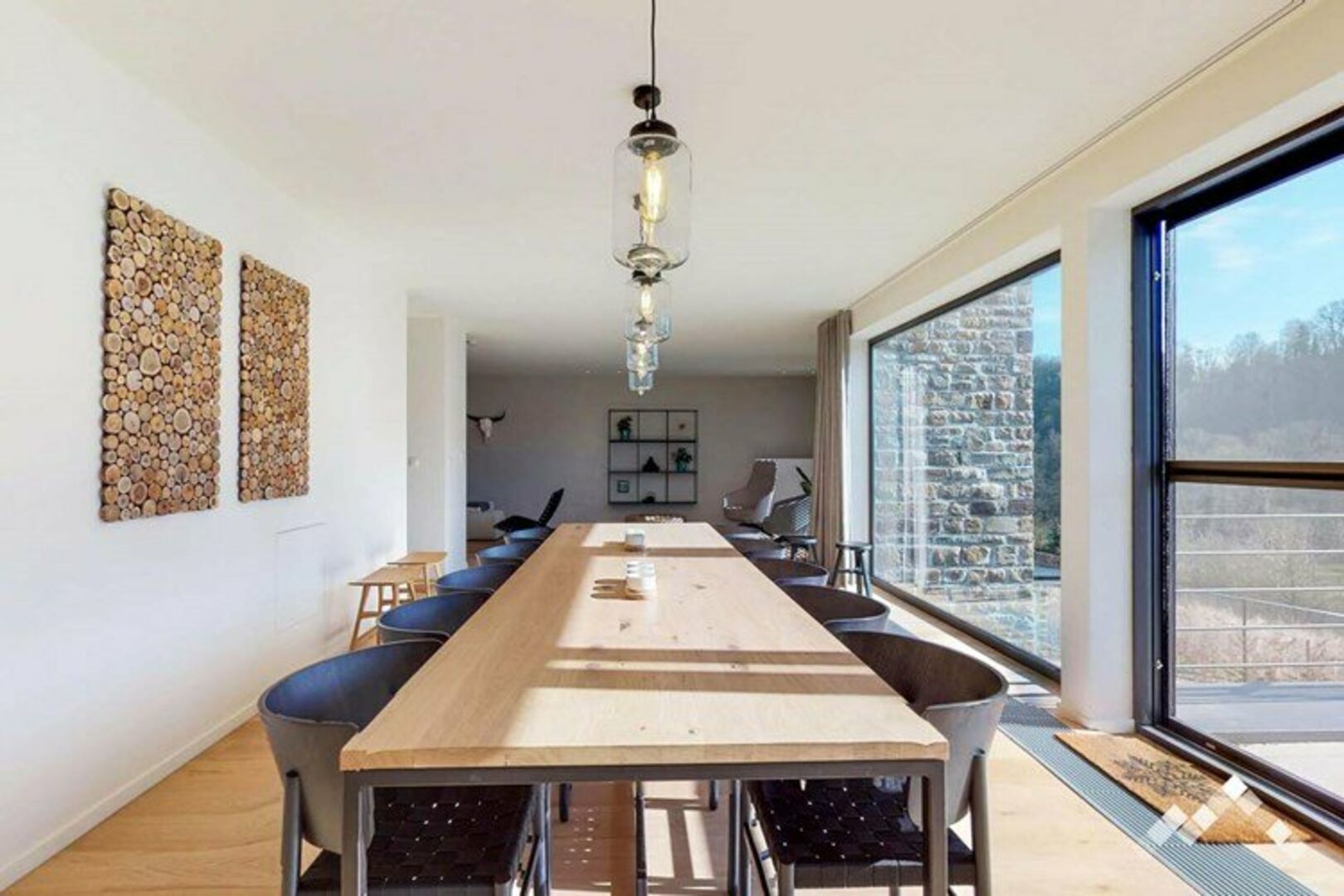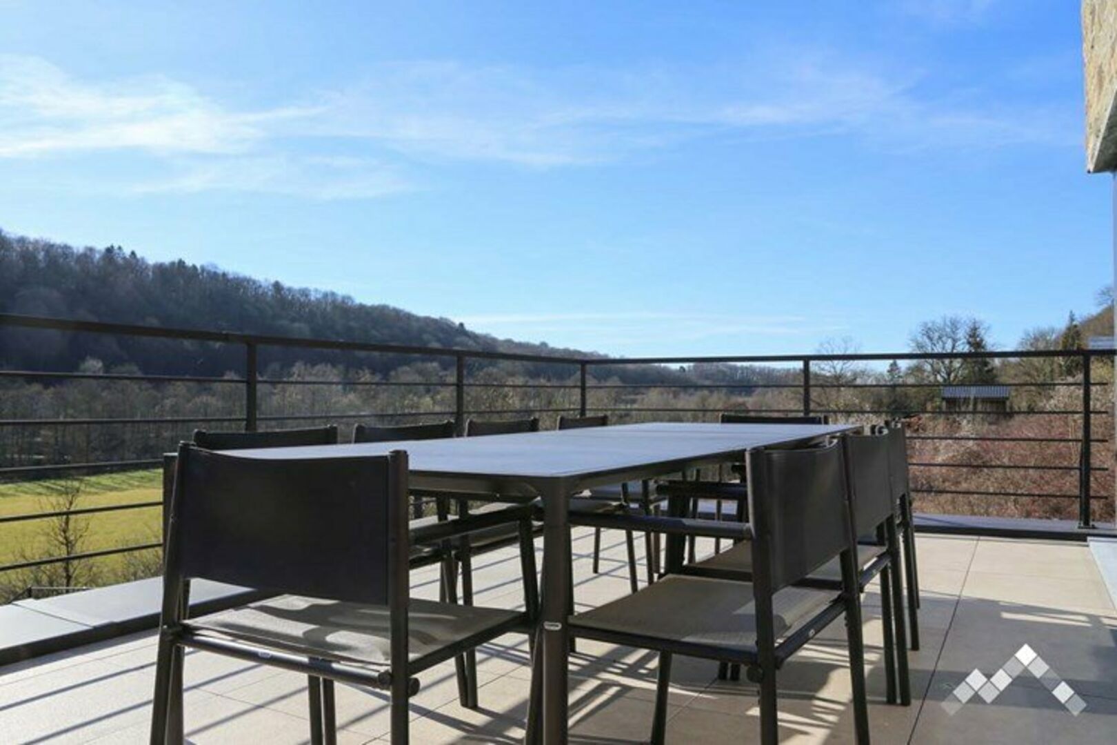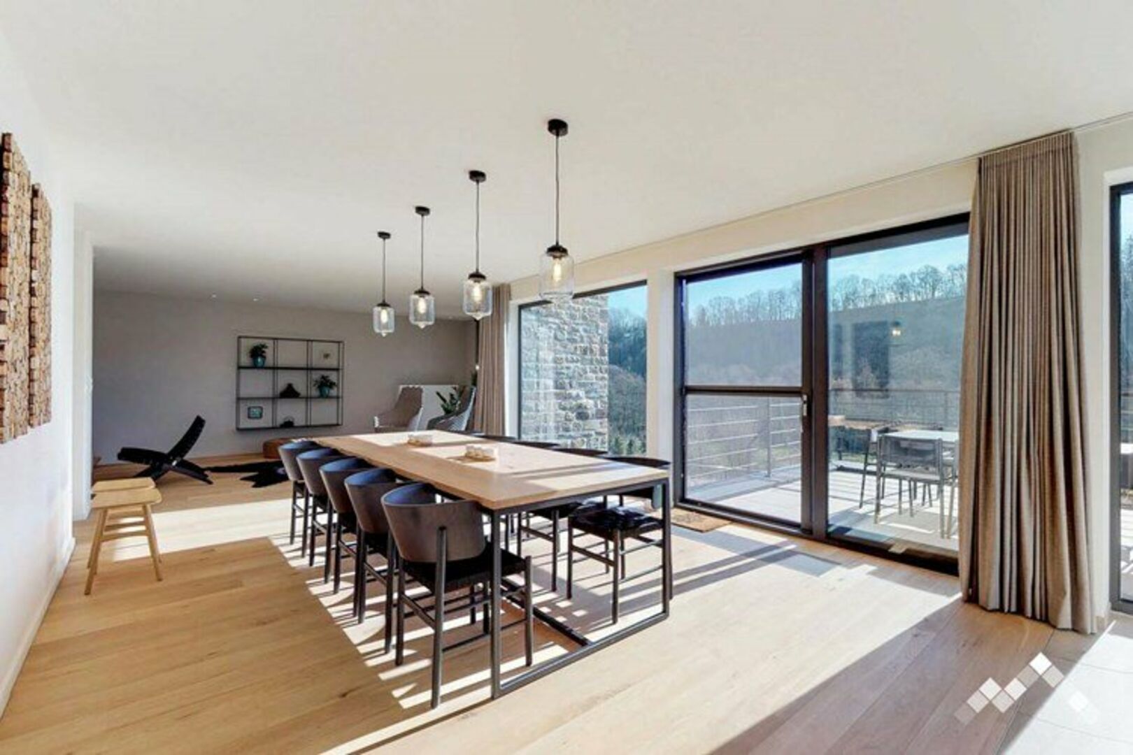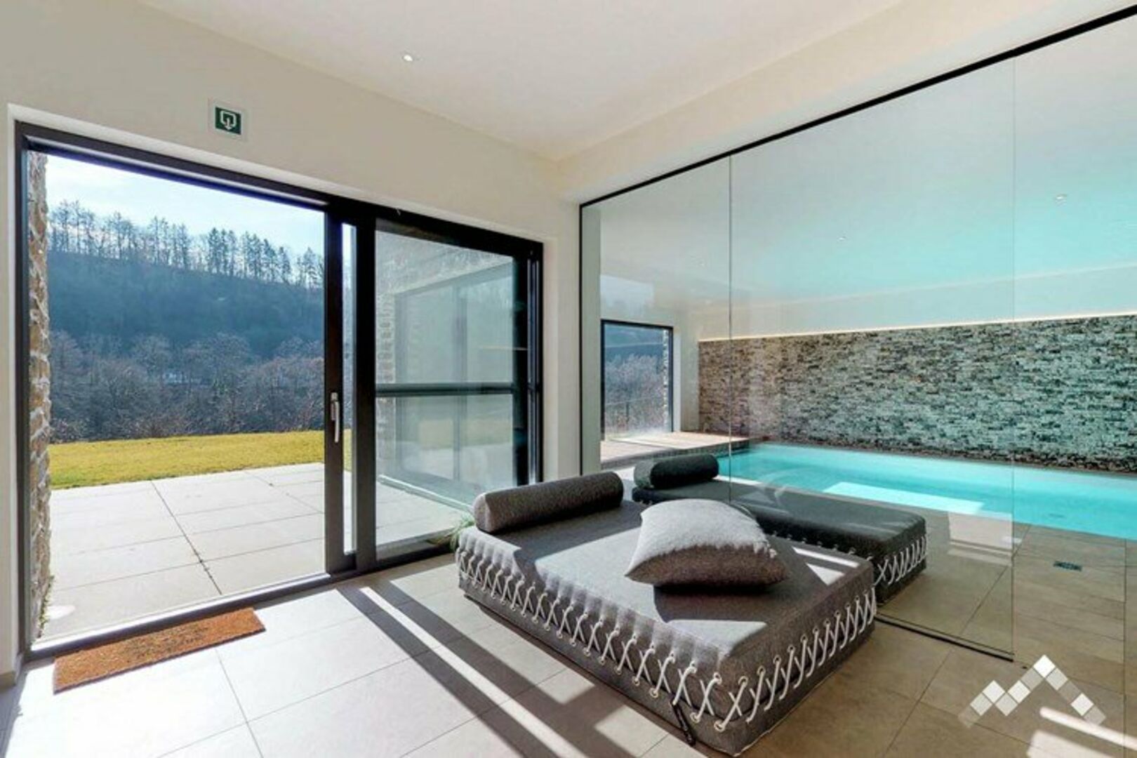 Ruime, comfortabele en stijlvolle vakantiewoning op wandelafstand van Durbuy met sauna, relaxruimte en binnenzwembad met uitzicht over de vallei.